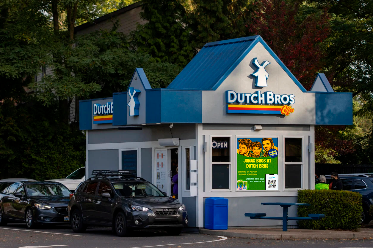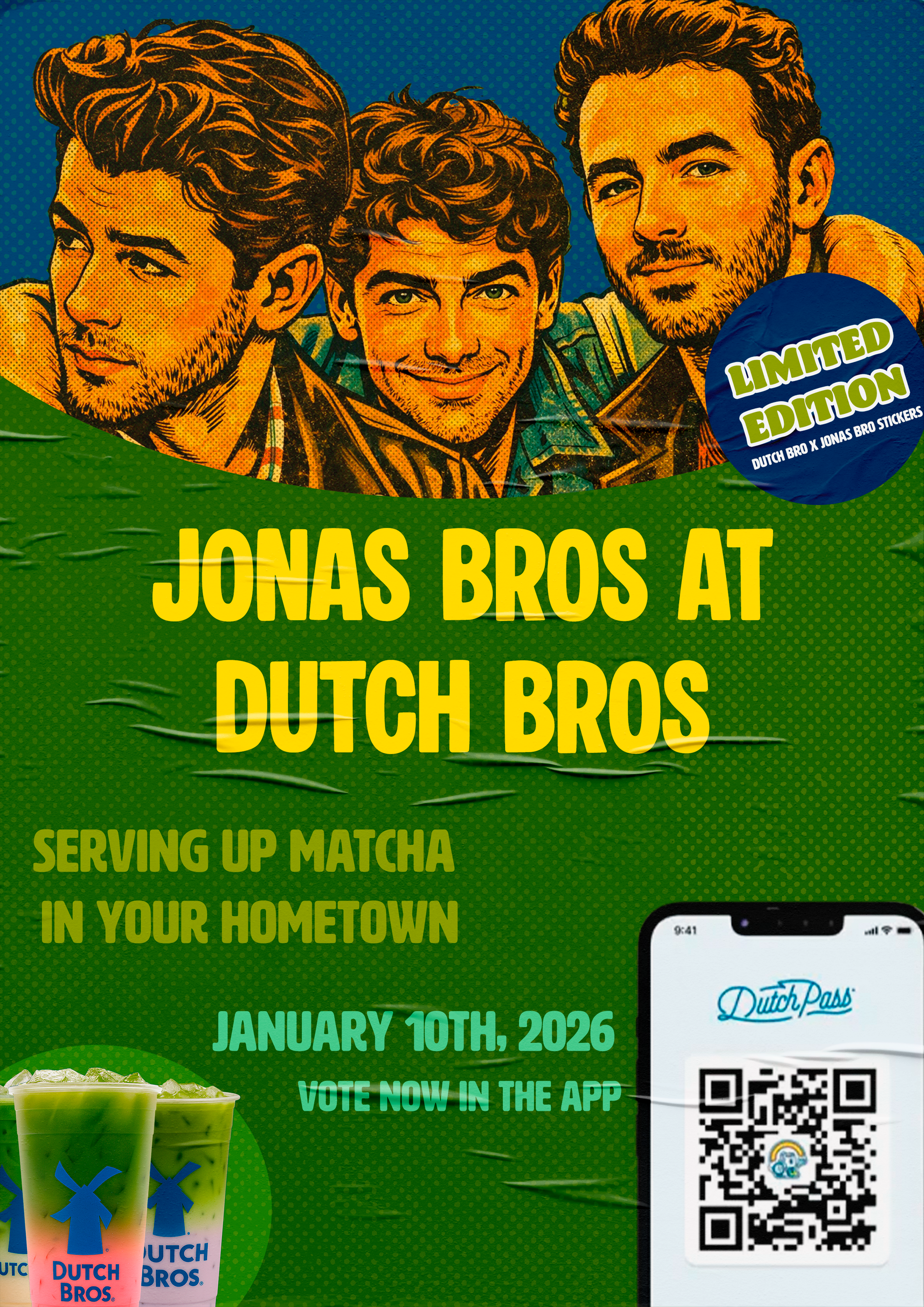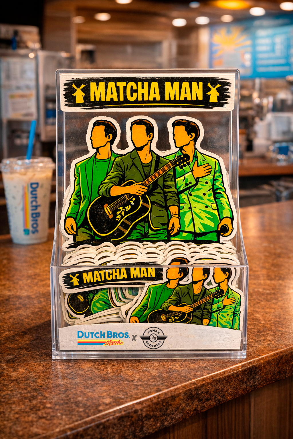 Dutch Bros. stickers make every trip more fun, so Dutch Bros. creates Jonas Bros. stickers to spread the matcha man joy long after the drink is finished. One collectible will be handed out with every matcha drink ordered.